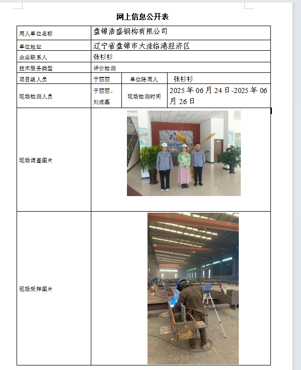盘锦浩盛钢构有限公司职业病危害现状评价报告书