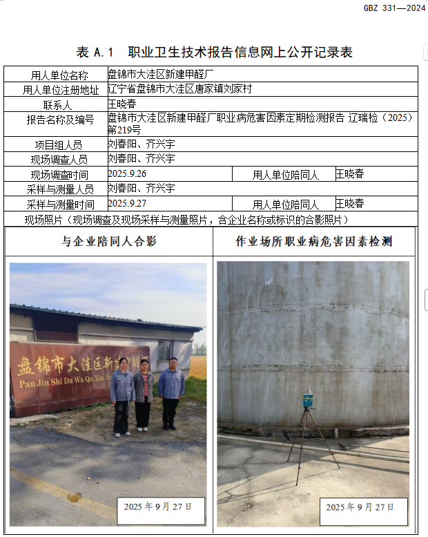 盘锦市大洼区新建甲醛厂职业病危害因素定期检测报告