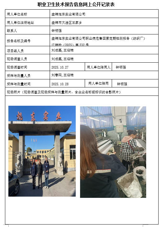 盘锦旭东实业有限公司职业病危害因素定期检测报告(纺织厂)