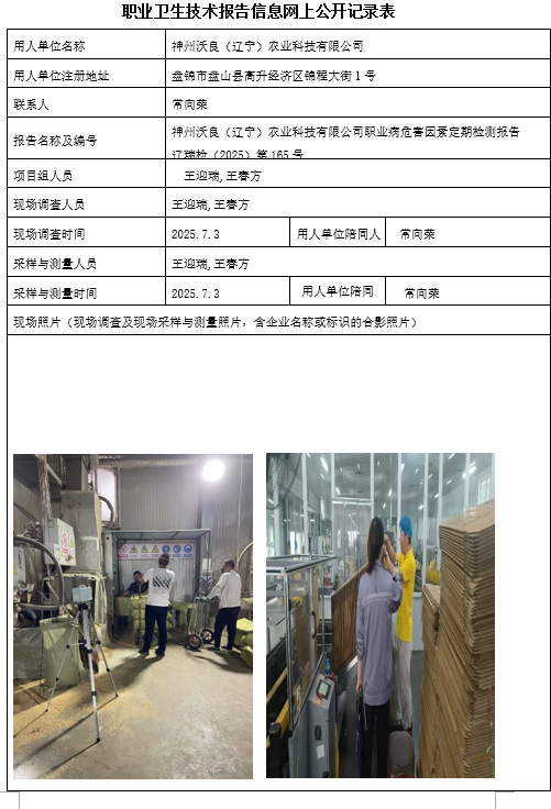 神州沃良(辽宁)农业科技有限公司职业病危害因素定期检测报告