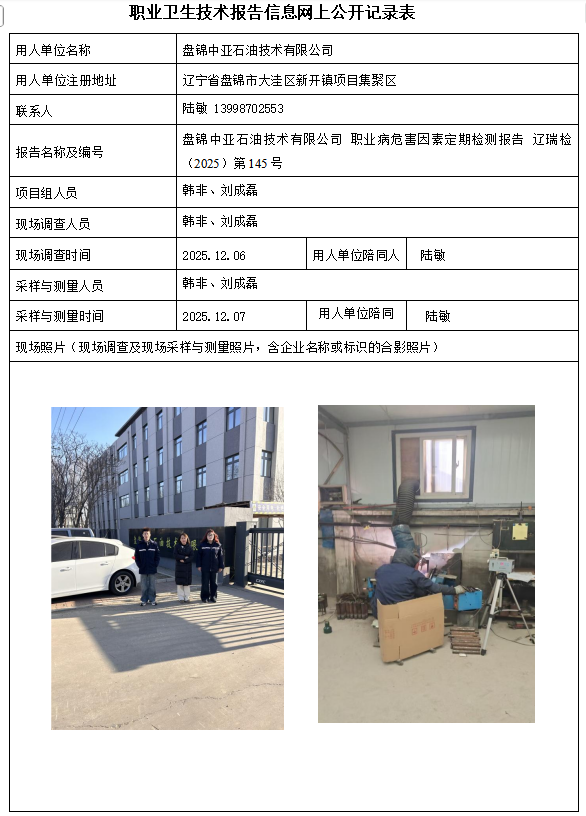 盘锦辽河泰成建设实业有限公司 2025年度职业病危害现状评价报告