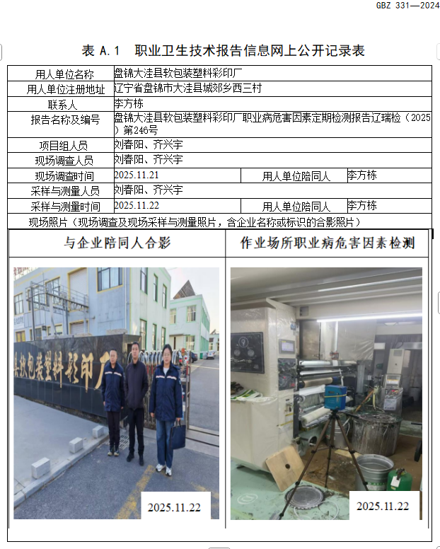 盘锦辽河泰成建设实业有限公司 2025年度职业病危害现状评价报告
